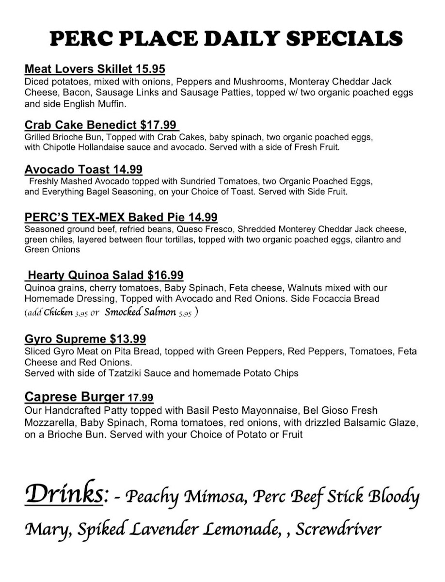 Perc Place also features a selection of daily specials, including the hearty Meat Lovers Skillet and fresh Crab Cake Benedict. The atmosphere is vibrant, reflecting the culinary passion echoed in the glowing reviews from satisfied patrons. Many guests rave about the attentive service and the quality of dishes, noting experiences that make each meal memorable. This isn’t just a place to eat; it’s a destination to savor delicious food with family and friends.